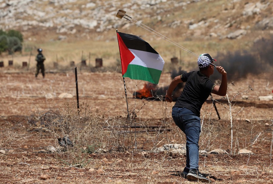 A Palestinian protester uses a slingshot to hurl a stone at Israeli soldiers during clashes following a protest against the expansion of Jewish settlements in the West Bank village of Beit Dajan, east of Nablus, on July 1, 2022. (Photo by Ayman Nobani/Xinhua)