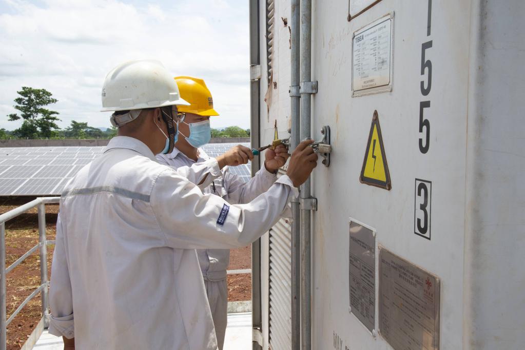 Engineers work at Sakai photovoltaic power plant in Bimbo, near Bangui, in Central African Republic, June 2, 2022. (Xinhua/Luo Yu)