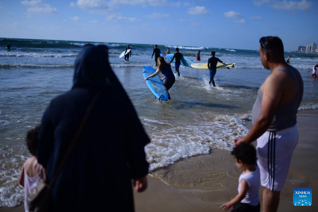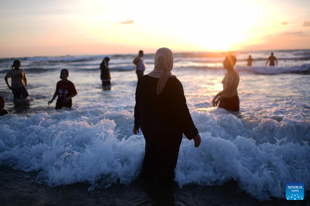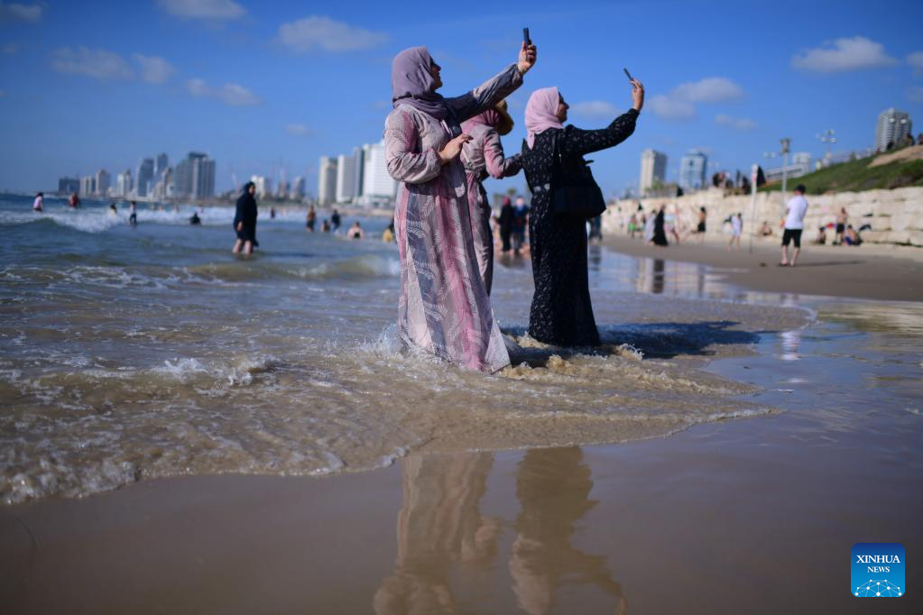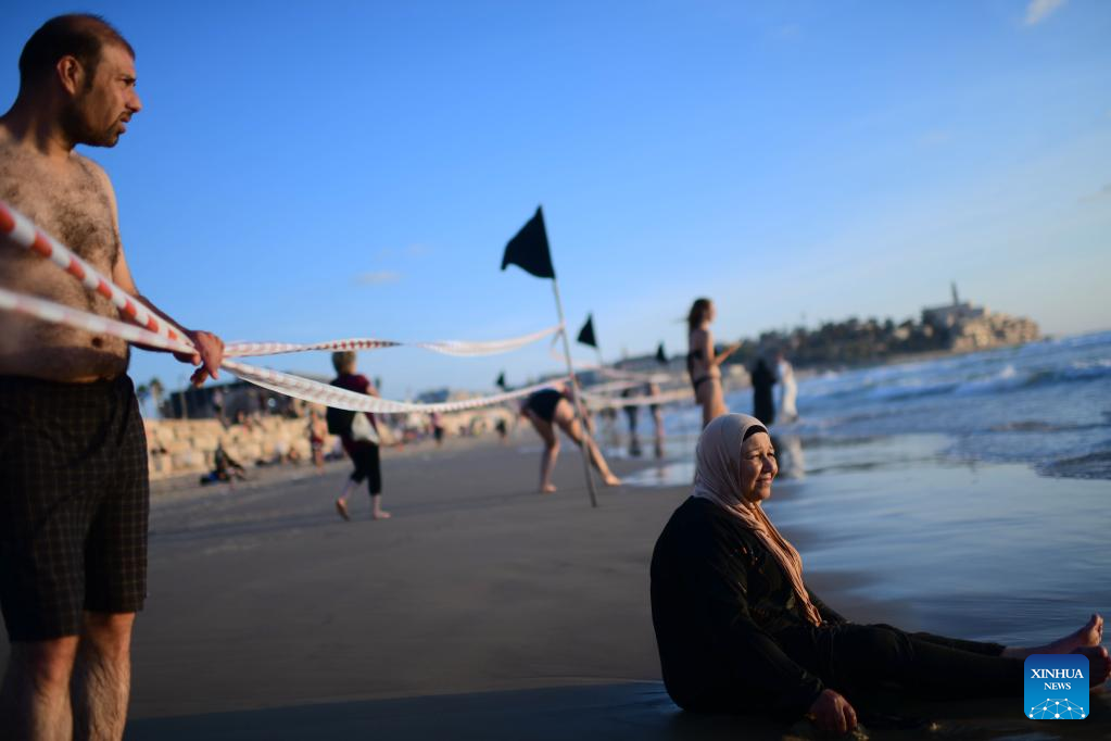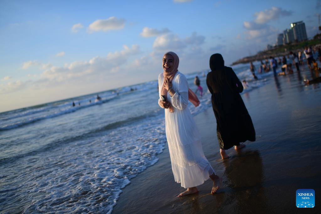 People spend time at the seaside during the holiday of Eid al-Adha in Tel Aviv, Israel, on July 11, 2022. (Tomer Neuberg/JINI via Xinhua)