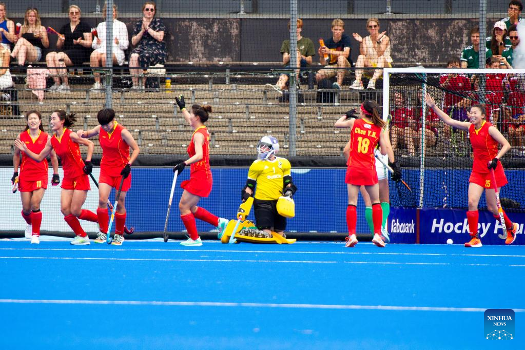 Players of China celebrate scoring during the FIH Hockey Women's World Cup 2022 match between China and Ireland in Amsterdam, the Netherlands, July 12, 2022. (Photo by Sylvia Lederer/Xinhua)