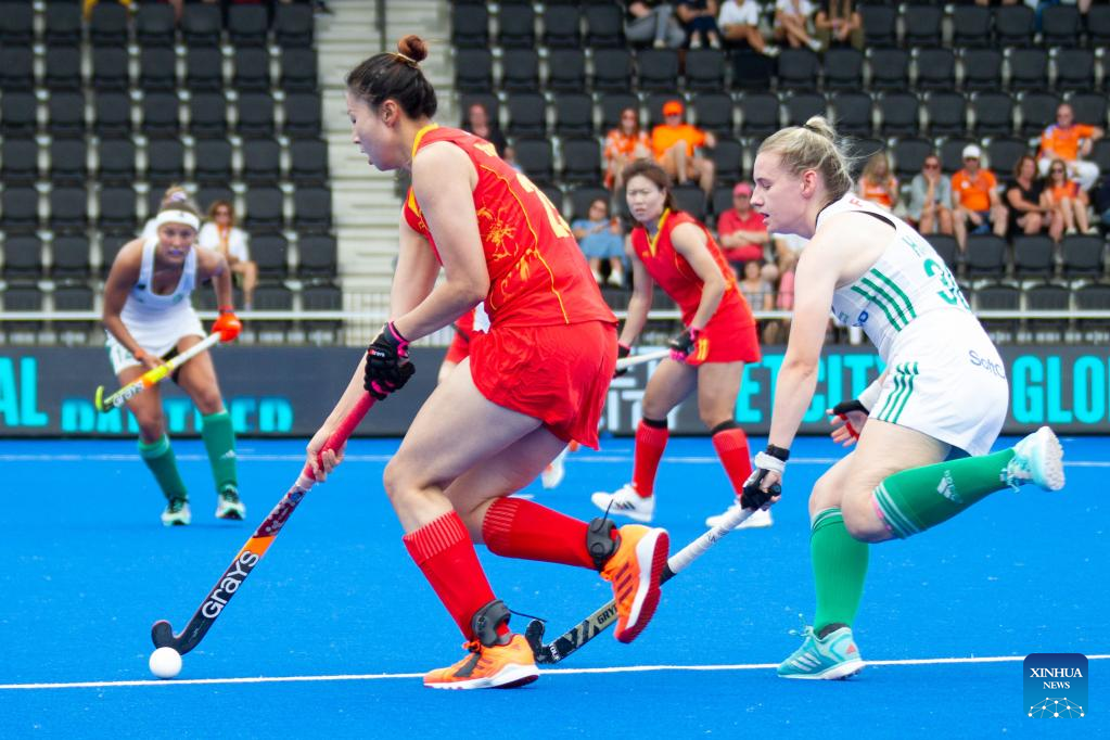 Yang Haoting (L) of China vies with Christina Hamill of Ireland during the FIH Hockey Women's World Cup 2022 match between China and Ireland in Amsterdam, the Netherlands, July 12, 2022. (Photo by Sylvia Lederer/Xinhua)