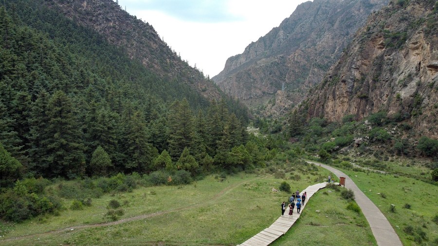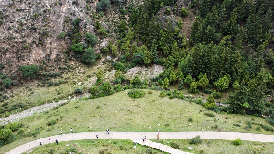 Aerial photo taken on July 11, 2022 shows tourists visiting the Helan Mountain National Nature Reserve.