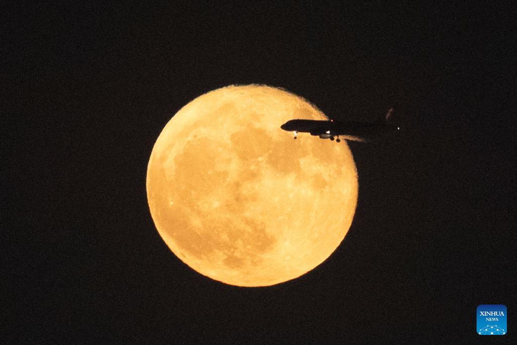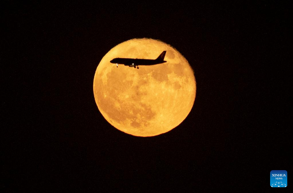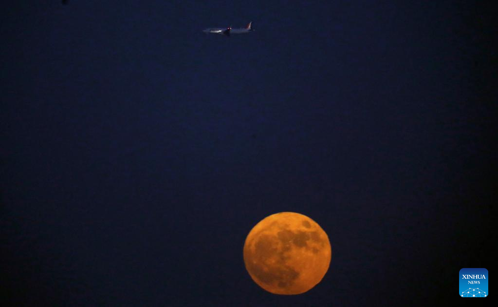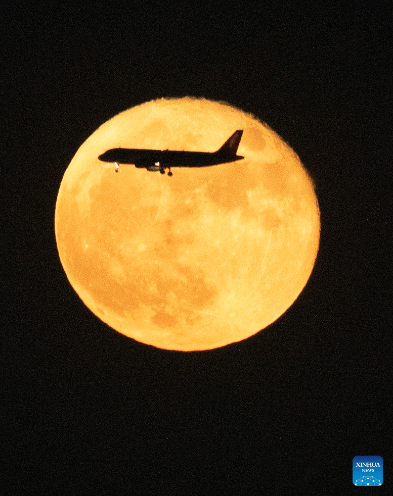 A plane is silhouetted against the supermoon over Cairo, Egypt, on July 14, 2022. (Xinhua/Ahmed Gomaa)