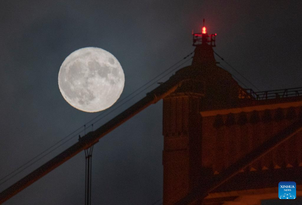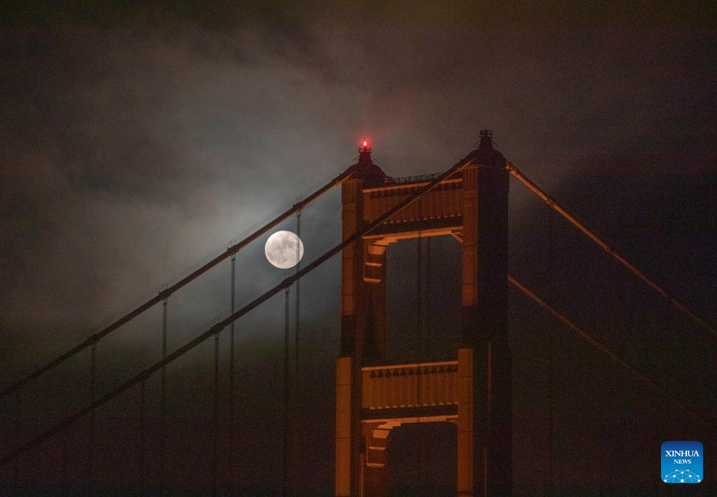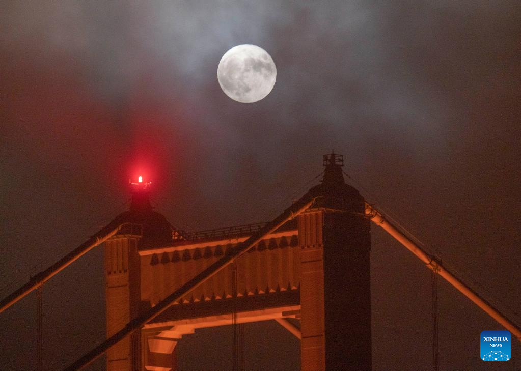 A supermoon is pictured near the Golden Gate Bridge in San Francisco, the United States, July 13, 2022. (Photo by Li Jianguo/Xinhua)