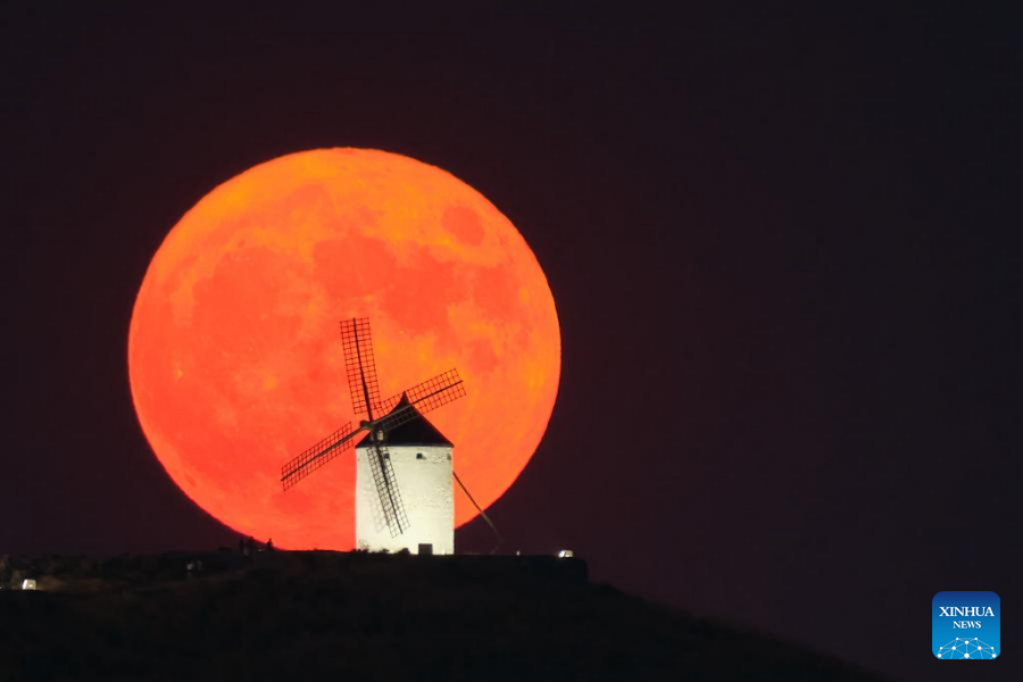 Photo taken on July 13, 2022 shows a supermoon and a windmill in Consuegra, Spain. (Xinhua/Meng Dingbo)