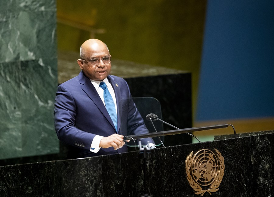 Abdulla Shahid, president of the 76th session of the UN General Assembly, speaks during an emergency special session of the UN General Assembly on Ukraine at the UN headquarters in New York, on Feb. 28, 2022. (Xinhua/Wang Ying)