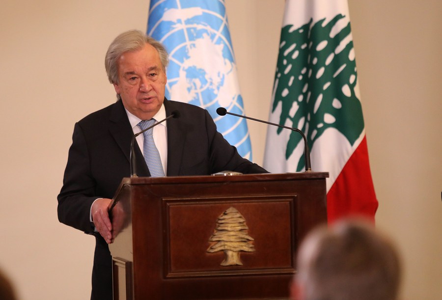 Visiting Secretary-General of the United Nations Antonio Guterres speaks at a press conference at Baabda Palace near Beirut, Lebanon, on Dec. 19, 2021. Guterres on Sunday urged the international community to increase its support for Lebanon, Lebanese TV station al-Jadeed reported. (Xinhua/Bilal Jawich)