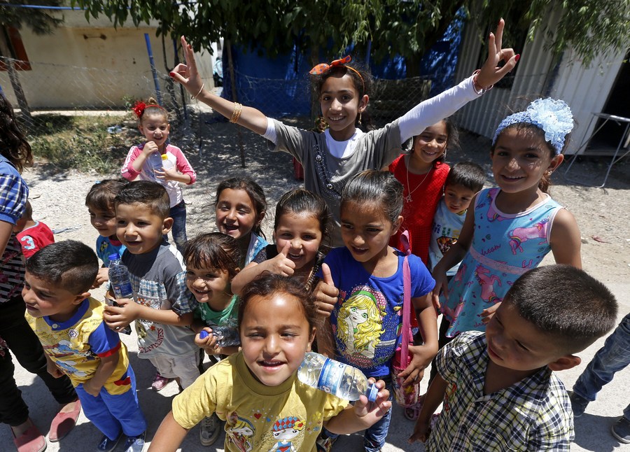 Refugee children pose for a photograph at a Syrian refugee camp in Bar Elias, Bekaa Valley, eastern Lebanon, on June 19, 2018, ahead of World Refugee Day. After years of war in Syria, Syrian refugees continued their lives in Lebanon. (Xinhua/Bilal Jawich)