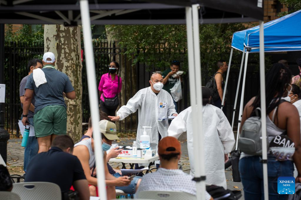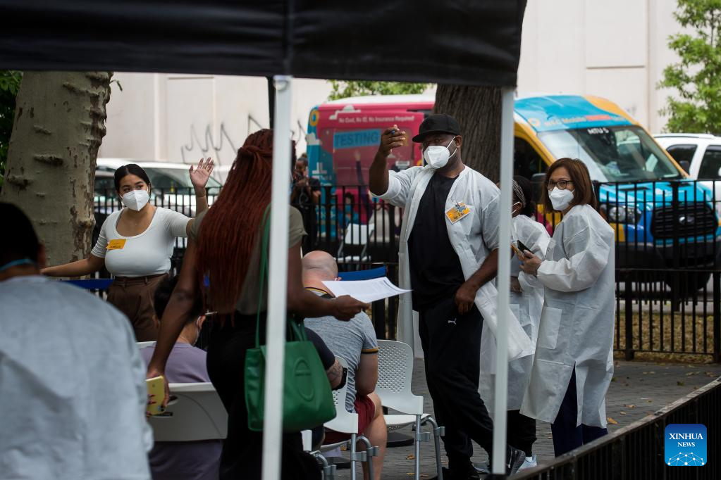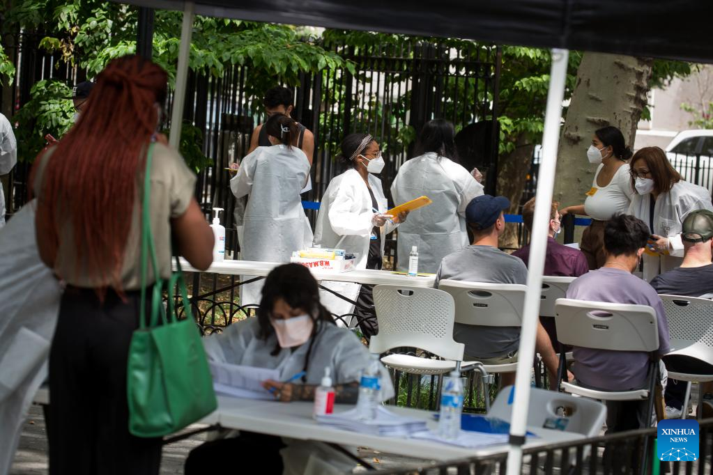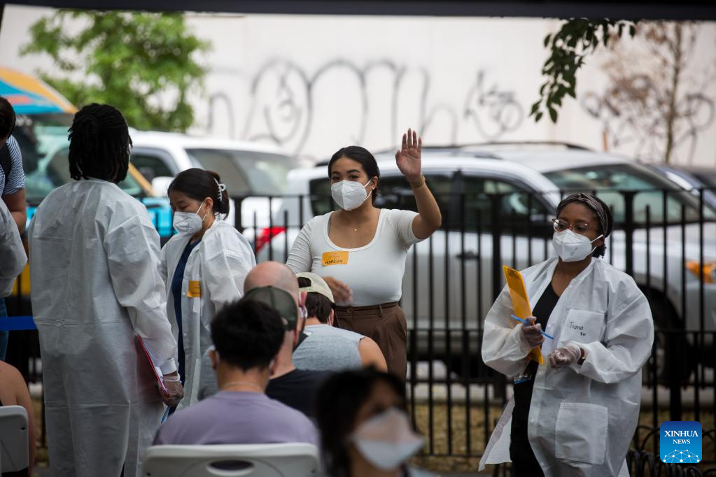 Health care workers assist people waiting to be vaccinated at a monkeypox vaccination site in New York, the United States, on July 14, 2022. The U.S. is increasing testing capacity and vaccine supply to address monkeypox outbreak as more than 1,000 confirmed cases have been reported nationwide. (Photo by Michael Nagle/Xinhua)