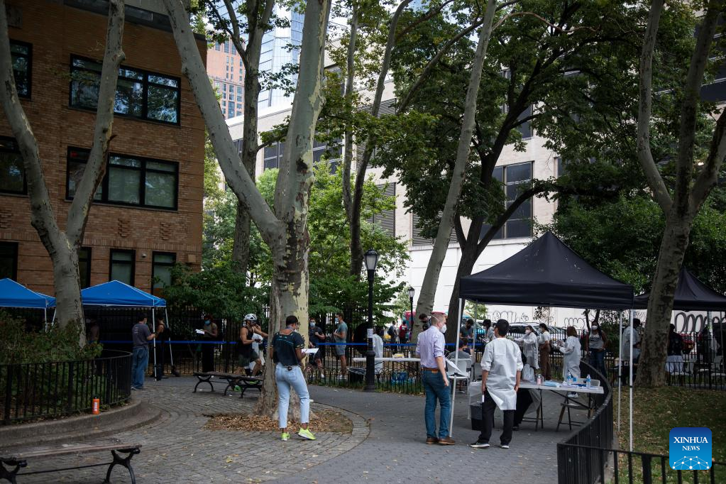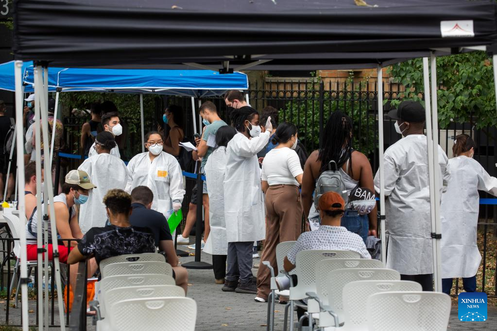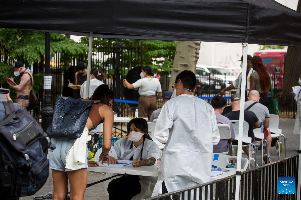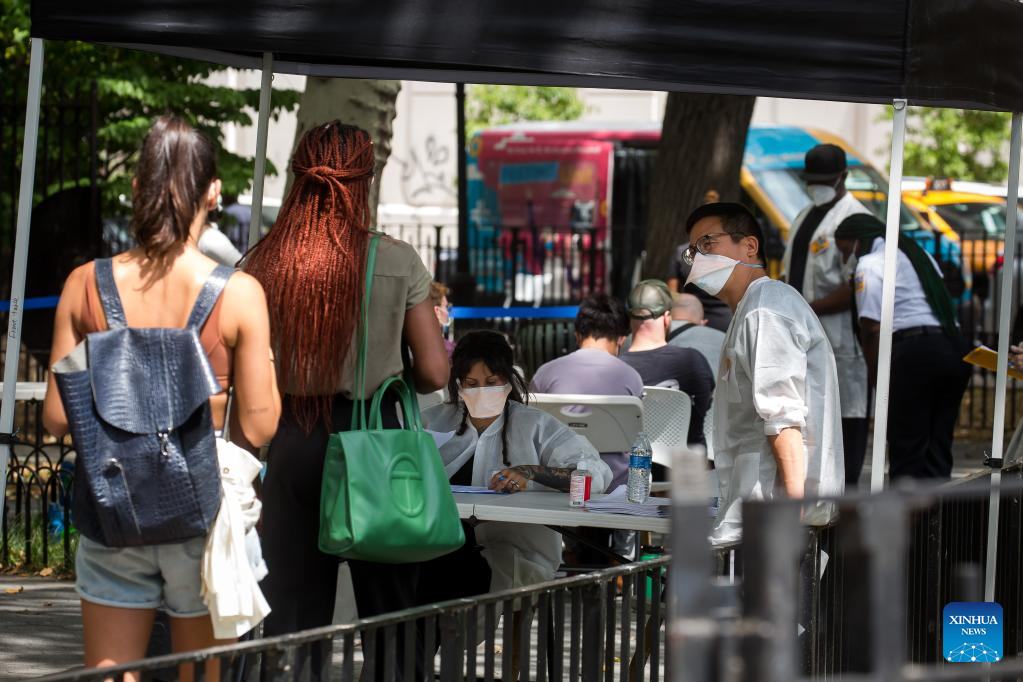 People wait at a monkeypox vaccination site in New York, the United States, on July 14, 2022. The U.S. is increasing testing capacity and vaccine supply to address monkeypox outbreak as more than 1,000 confirmed cases have been reported nationwide. (Photo by Michael Nagle/Xinhua)