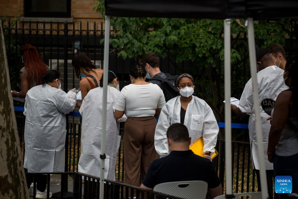 People wait to be vaccinated at a monkeypox vaccination site in New York, the United States, on July 14, 2022. The U.S. is increasing testing capacity and vaccine supply to address monkeypox outbreak as more than 1,000 confirmed cases have been reported nationwide. (Photo by Michael Nagle/Xinhua)