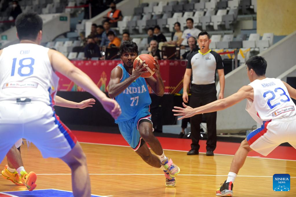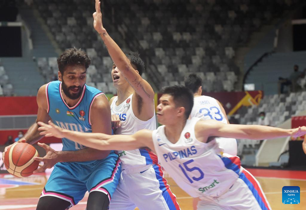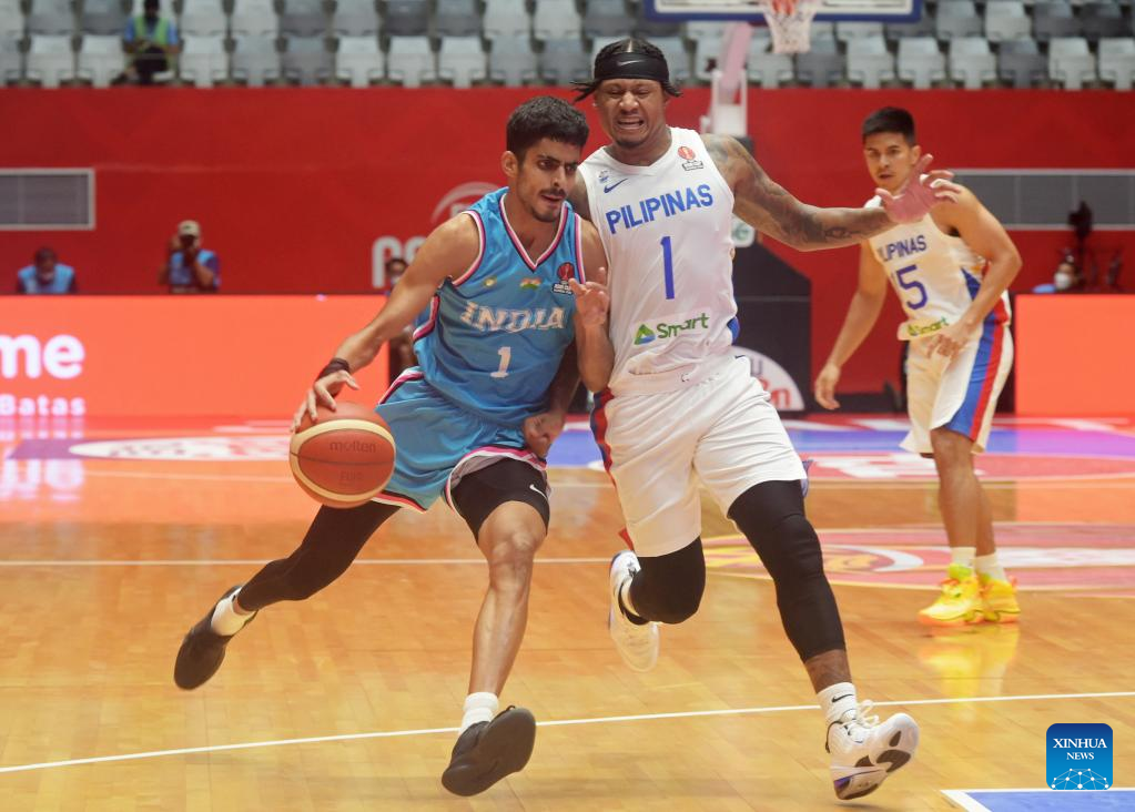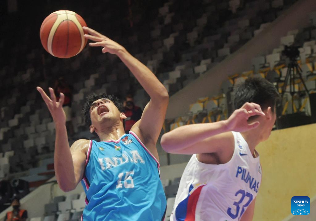 Arvind Kumar Muthu Krishnan (2nd L) of India competes during a Group D match between the Philippines and India of the FIBA Asia Cup 2022 in Jakarta, Indonesia, July 15, 2022. (Xinhua/Zulkarnain)