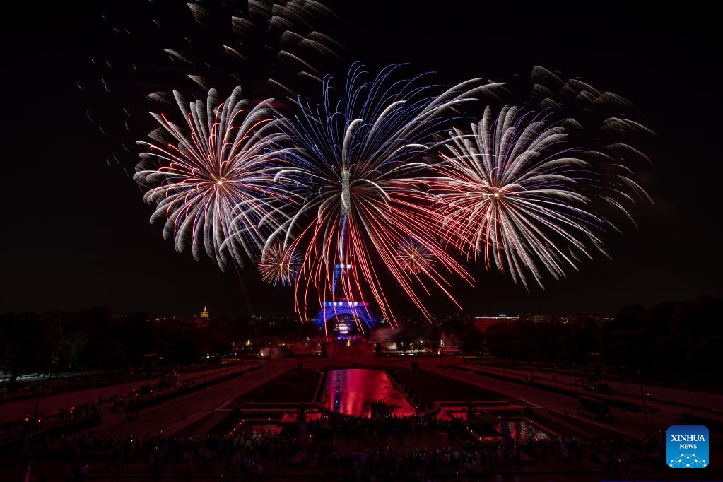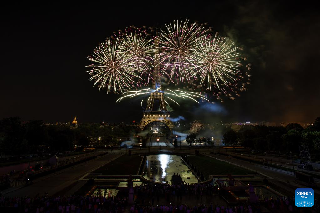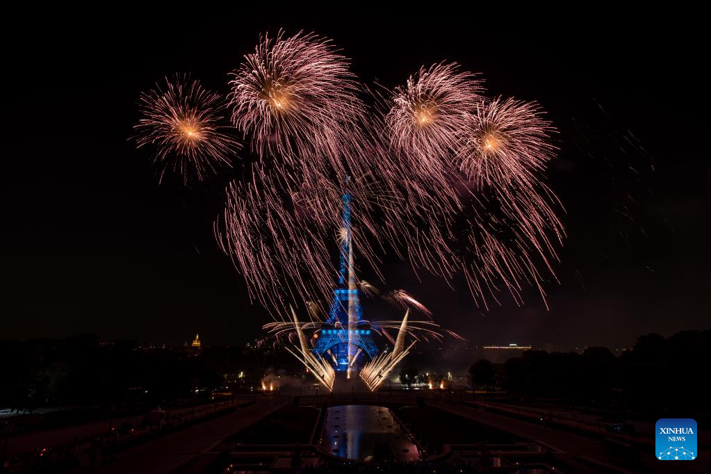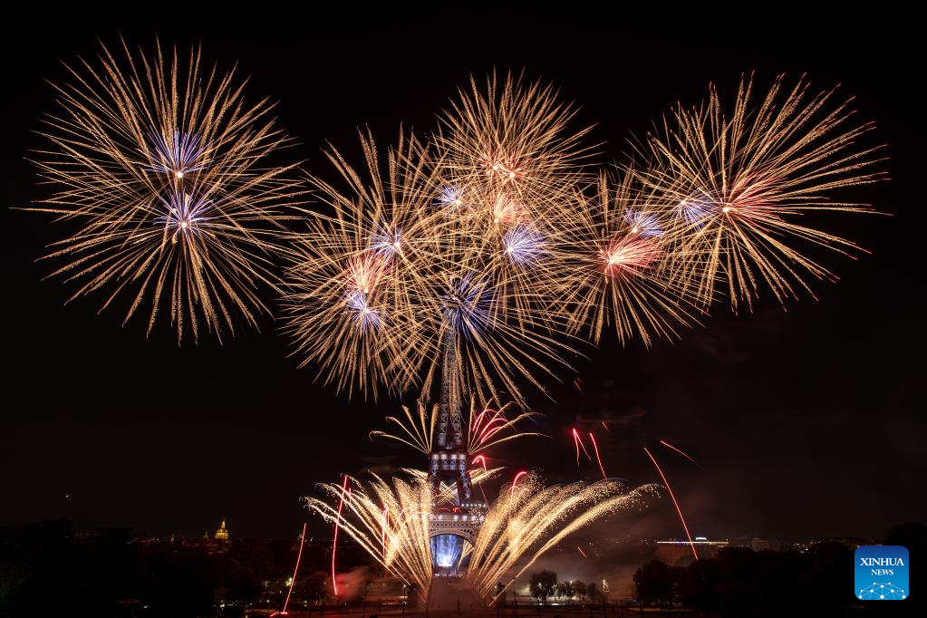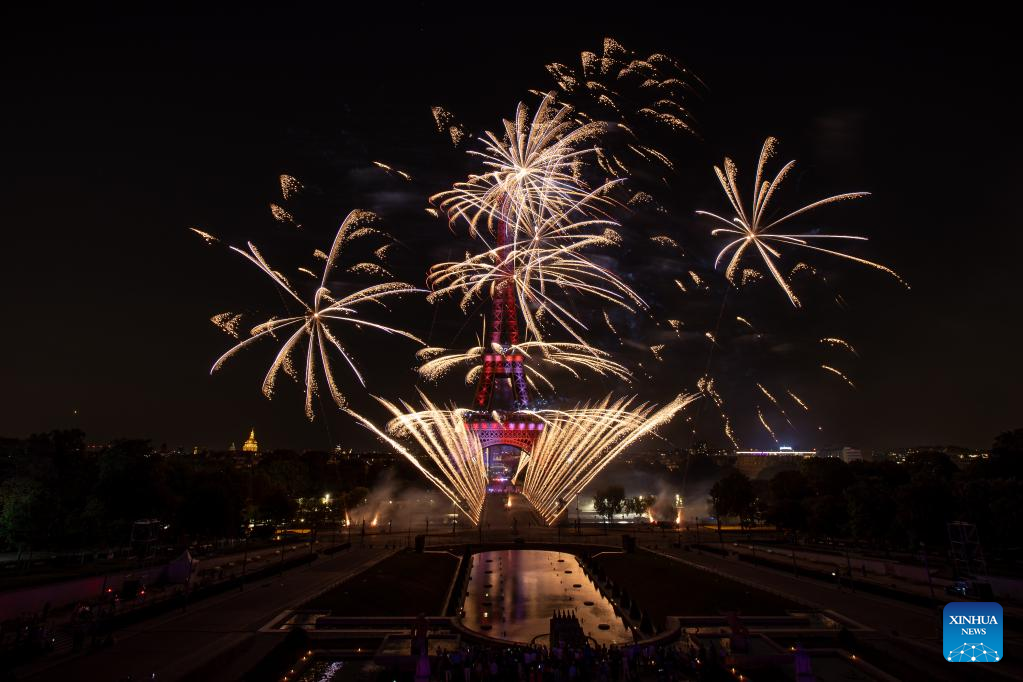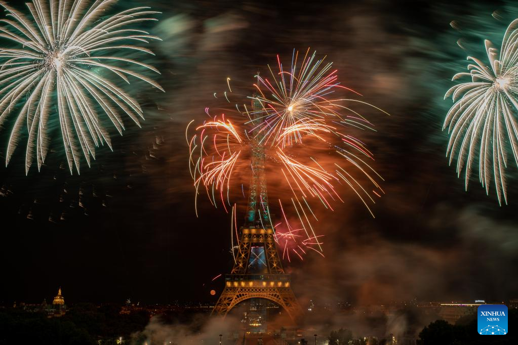 Fireworks explode near the Eiffel Tower during the Bastille Day celebrations in Paris, France, July 14, 2022. (Photo by Aurelien Morissard/Xinhua)