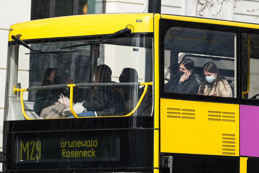 Passengers wearing face masks are seen on a bus in Berlin, capital of Germany, April 1, 2022. (Photo by Stefan Zeitz/Xinhua)