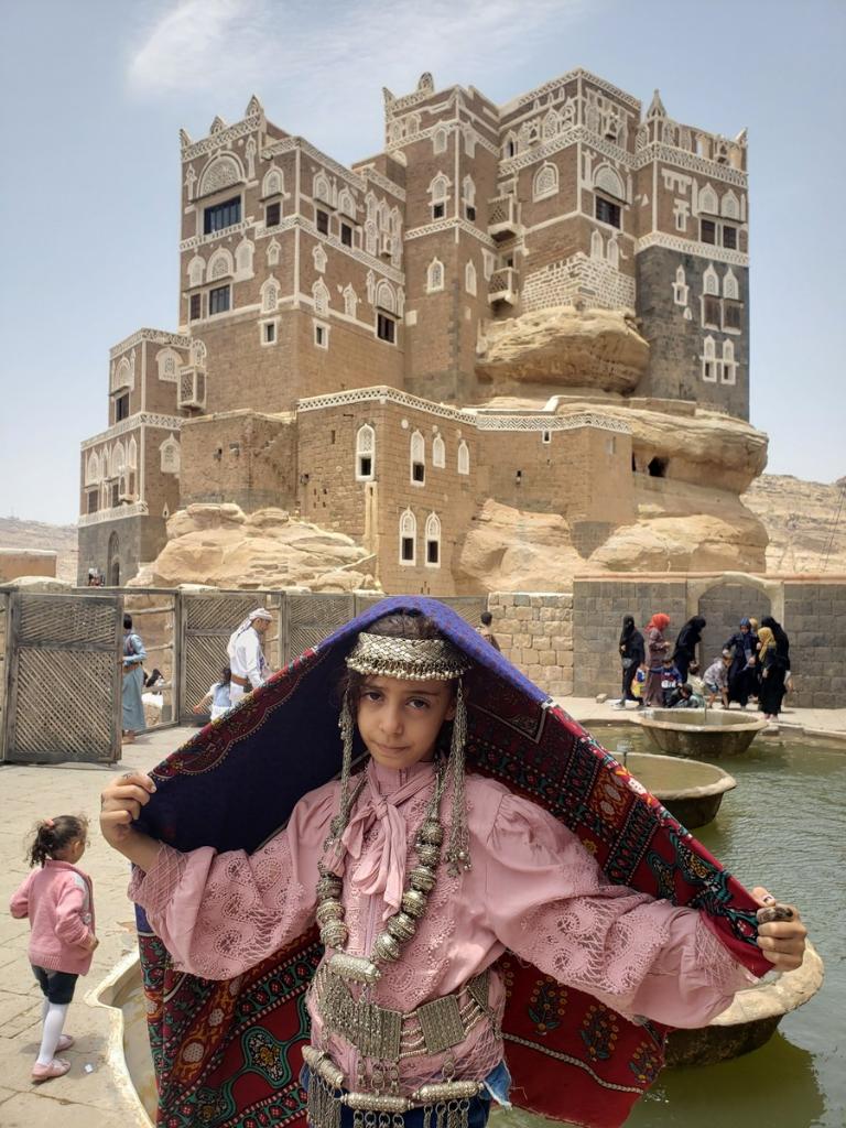 A girl wearing Yemen's traditional silver accessories and Sitarah (women's scarf), poses for a photo at the Rock Palace in Sanaa, capital of Yemen, on June 15, 2022. (Mohammed Mohammed/Xinhua). (Photo by Mohammed Mohammed/Xinhua)
