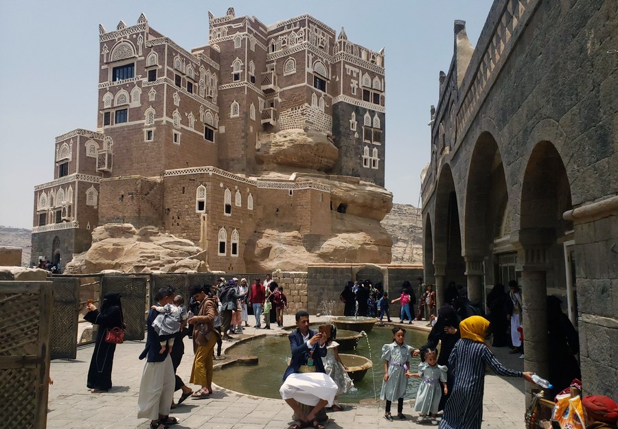 Yemenis visit the Rock Palace, a famous historic building in Yemen, during a national holiday, northwest of Sanaa, Yemen, on July 15, 2022. (Photo by Mohammed Mohammed/Xinhua)■