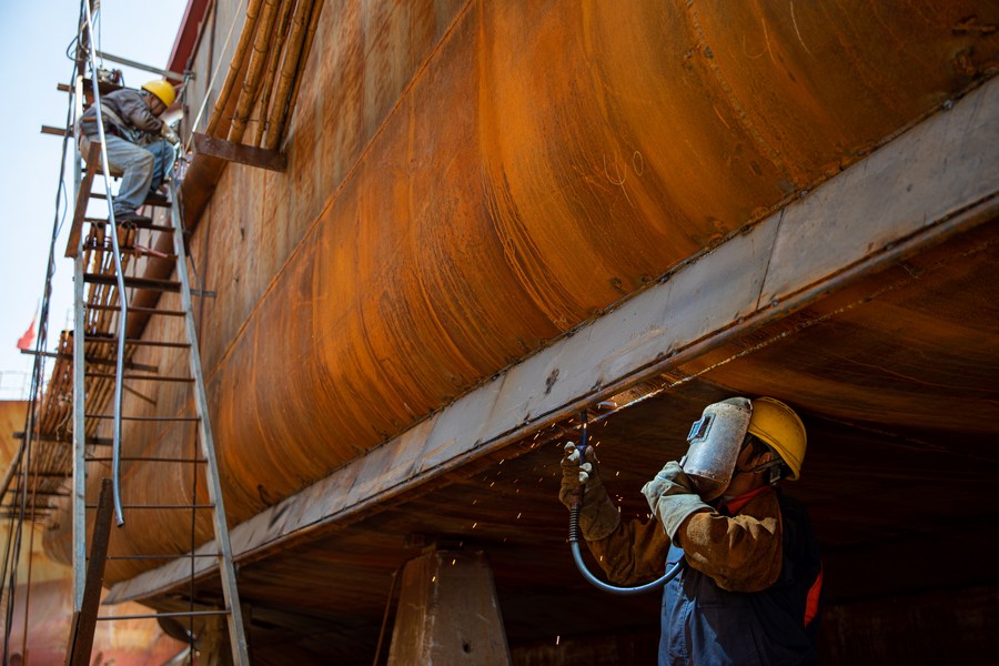 Workers perform welding tasks at a workshop of a shipbuilding enterprise in Wenling, east China's Zhejiang Province, June 24, 2022. (Photo by Xu Weijie/Xinhua)