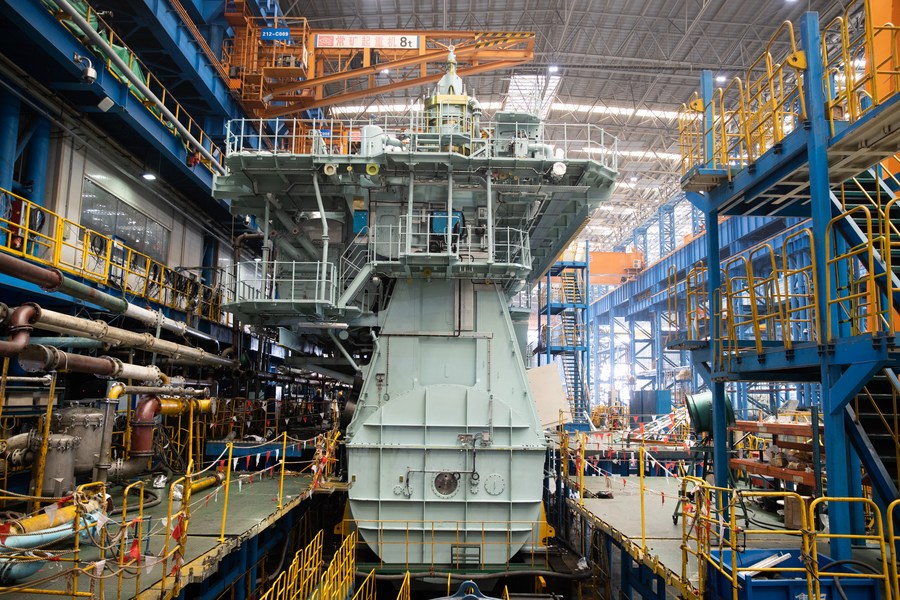 Workers assemble a ship engine at a workshop of CSSC-MES Diesel Co., Ltd. in east China's Shanghai, June 14, 2022. (Xinhua/Jin Liwang)