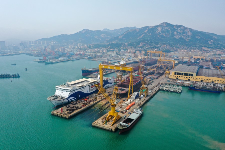 Aerial photo taken on May 20, 2022 shows a view of the Huanghai Shipbuilding Co., Ltd., in Rongcheng, east China's Shandong Province. (Xinhua/Zhu Zheng)