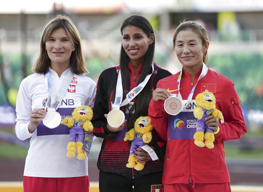 Gold medalist Kimberly Garcia Leon (C) of Peru, silver medalist Katarzyna Zdzieblo (L) of Poland and bronze medalist Qieyang Shijie of China attend the awarding ceremony of women's 20km race walk at the World Athletics Championships Oregon22 in Eugene, Oregon, the United States, July 15, 2022. (Xinhua/Wang Ying)