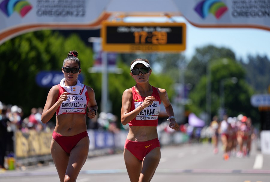 Kimberly Garcia Leon (L) of Peru competes with Qieyang Shijie of China during the women's 20km race walkat the World Athletics Championships Oregon22 in Eugene, Oregon, the United States, July 15, 2022. (Xinhua/Wang Ying)
