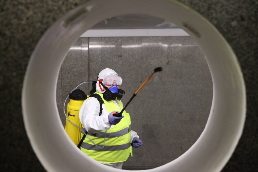 A worker disinfects a public space with ozone in Warsaw, Poland on April 10, 2021. (Str/Xinhua)