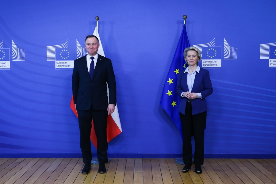 European Commission President Ursula von der Leyen meets with Polish President Andrzej Duda in Brussels, Belgium, Feb. 7, 2022. (Xinhua/Zheng Huansong)