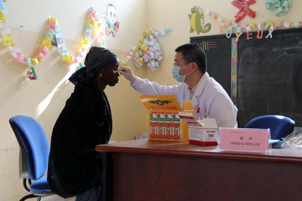 The file photo shows a doctor of Chinese medical team in Senegal examining the eyes of a local female patient in Darkar, capital of Senegal, Dec, 20, 2014. (Xinhua/Wang Meng)