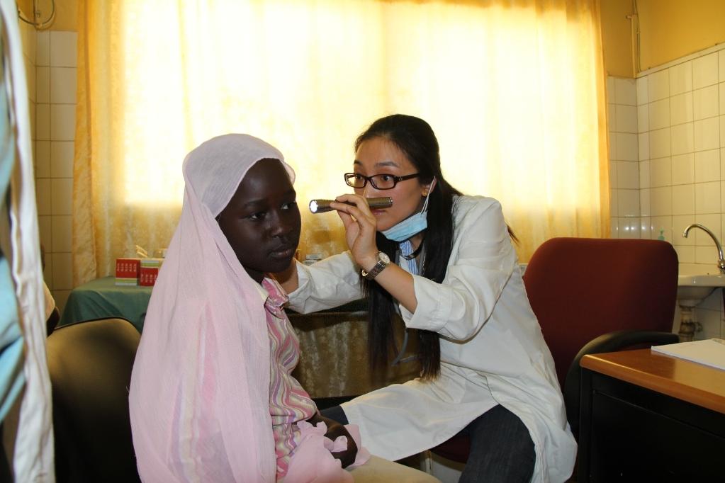 The file photo shows a doctor of Chinese medical team in Senegal examining the ear of a female patient at the Hann/Mer Medical Center in Darkar, capital of Senegal, March 31, 2013. (Xinhua/Wang Meng)
