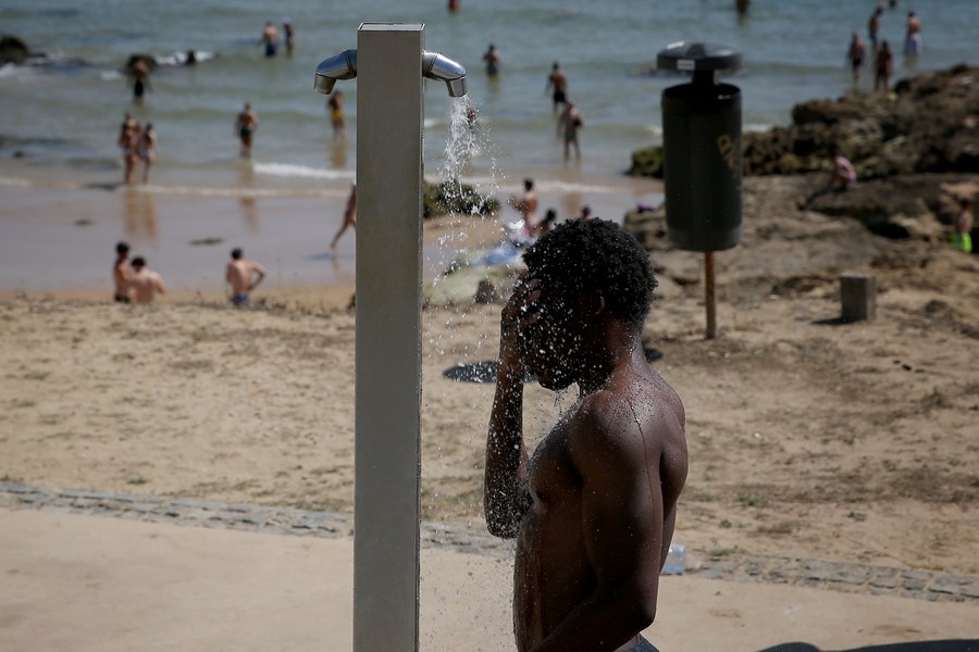 A man takes a shower at the Carcavelos beach in Cascais, Portugal, July 9, 2022. (Photo by Pedro Fiuza/Xinhua)