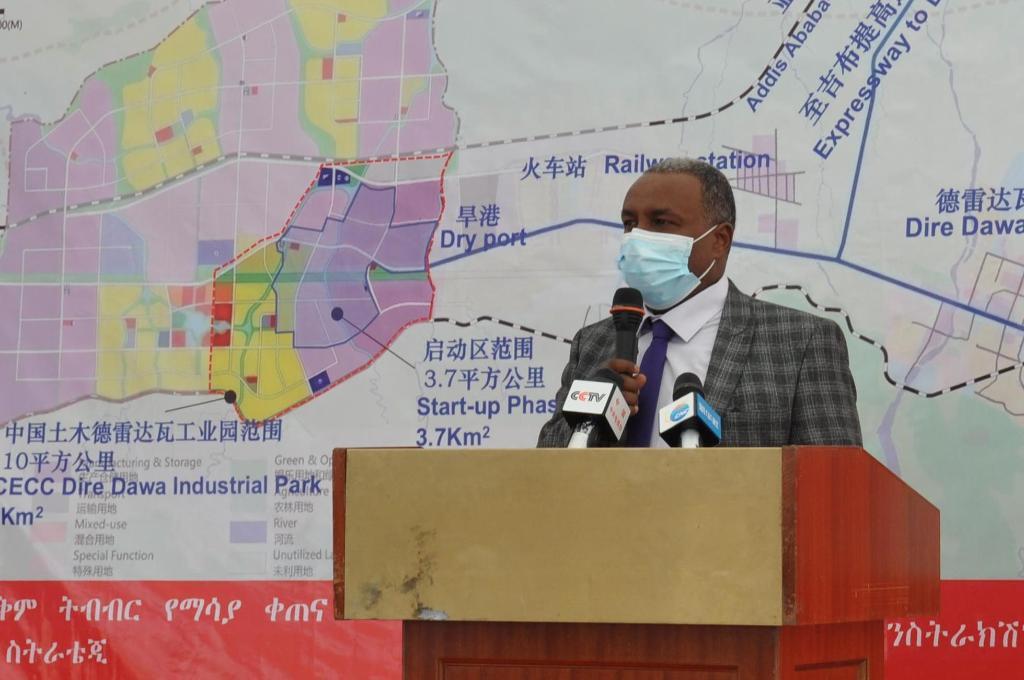 Dire Dawa City Mayor Ahmed Mohamed Bouh speaks at the launching ceremony of the China Civil Engineering Construction Corporation (CCECC) Dire Dawa Industrial Park in Dire Dawa, Ethiopia, May 28, 2021. (Xinhua)