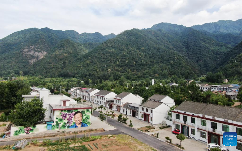 Aerial photo taken on July 5, 2022 shows a view of Caijiapo Village, Huyi District of Xi'an, northwest China's Shaanxi Province. Faculty and students of the Xi'an Academy of Fine Arts have been working with artists to transform villages by practicing their profession. Such transformation, combining rural tradition with modern lifestyles, turns plain grain fields and farmhouses into places of interest that promote rural culture and rural tourism. (Xinhua/Li Yibo)