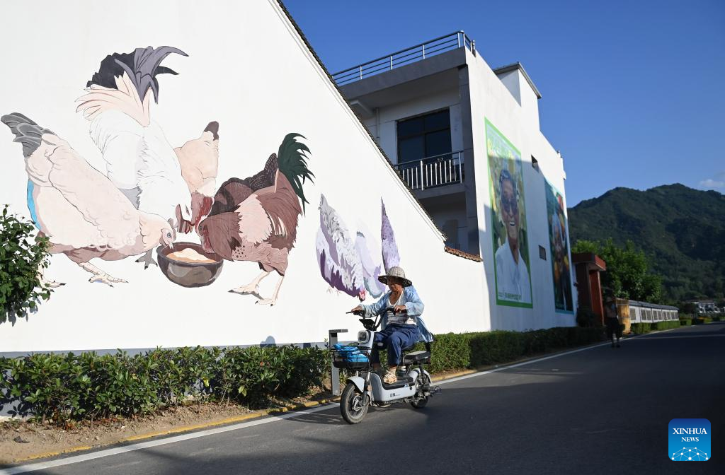 A villager passes a wall painting in Caijiapo Village, Huyi District of Xi'an, northwest China's Shaanxi Province, on July 5, 2022. Faculty and students of the Xi'an Academy of Fine Arts have been working with artists to transform villages by practicing their profession. Such transformation, combining rural tradition with modern lifestyles, turns plain grain fields and farmhouses into places of interest that promote rural culture and rural tourism. (Xinhua/Li Yibo)
