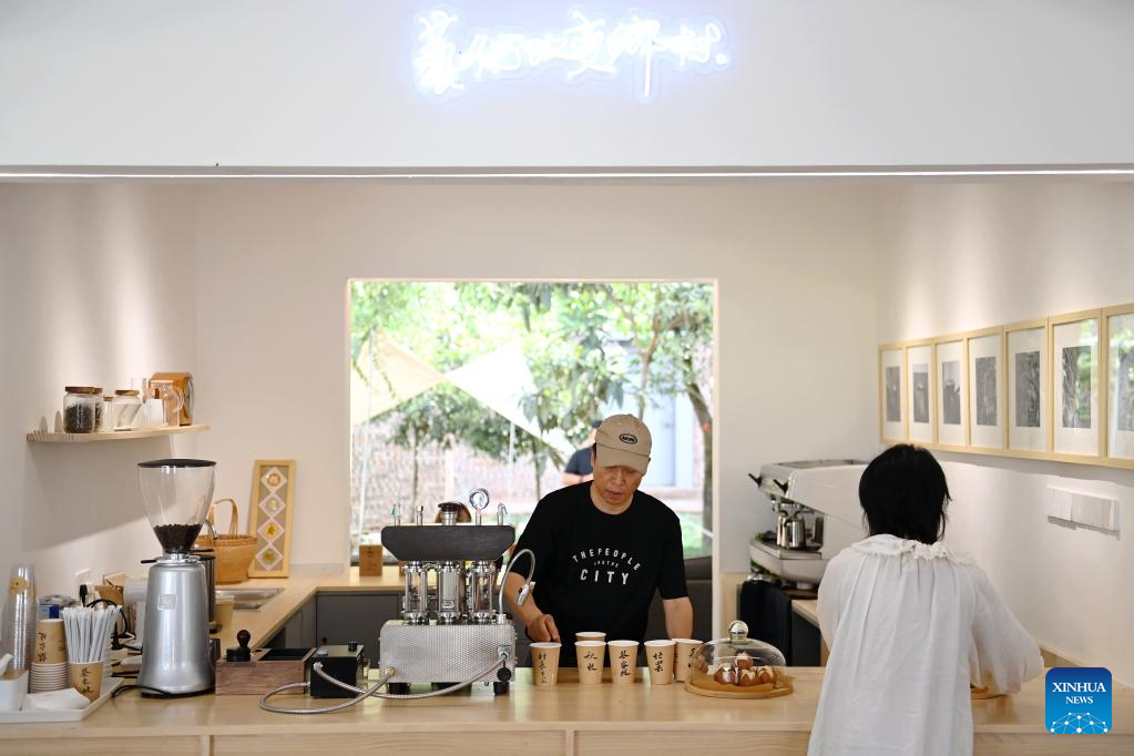 Barista Shen Hongyi (L) brews coffee for tourists at the Home of Artist in Caijiapo Village, Huyi District of Xi'an, northwest China's Shaanxi Province, on July 5, 2022. Faculty and students of the Xi'an Academy of Fine Arts have been working with artists to transform villages by practicing their profession. Such transformation, combining rural tradition with modern lifestyles, turns plain grain fields and farmhouses into places of interest that promote rural culture and rural tourism. (Xinhua/Li Yibo)