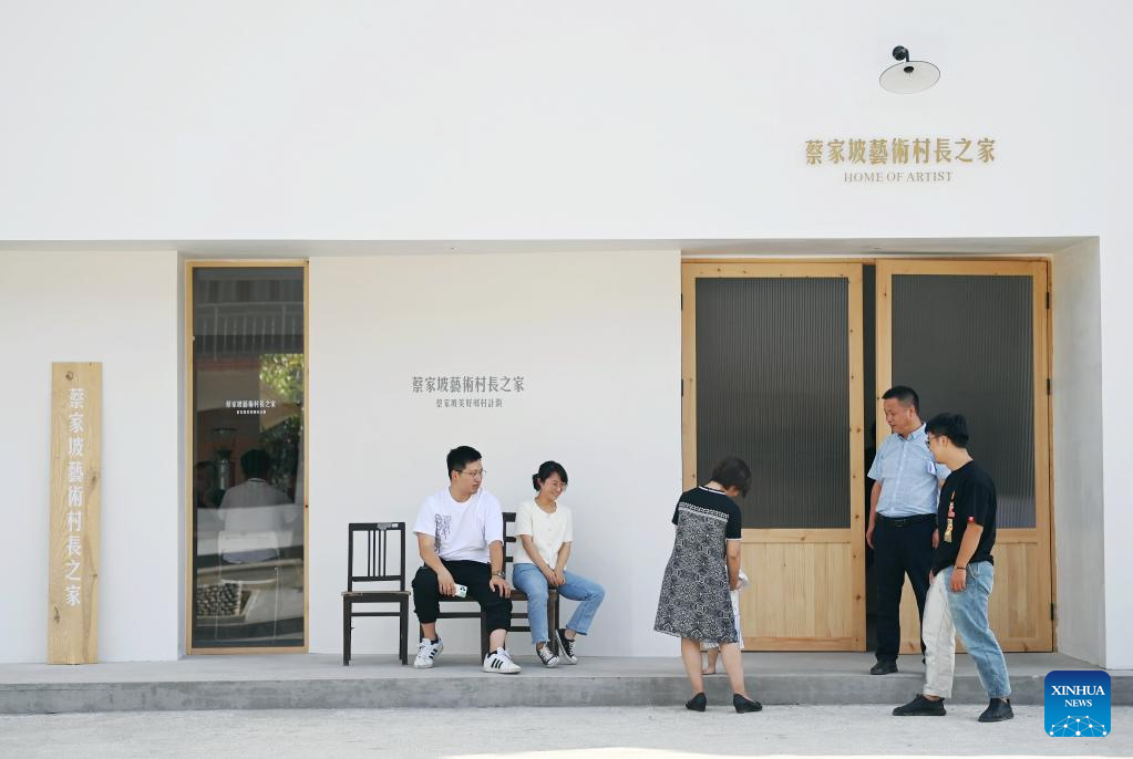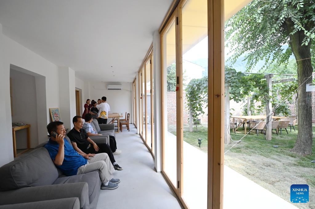 Tourists take a rest at the Home of Artist in Caijiapo Village, Huyi District of Xi'an, northwest China's Shaanxi Province, on July 5, 2022. Faculty and students of the Xi'an Academy of Fine Arts have been working with artists to transform villages by practicing their profession. Such transformation, combining rural tradition with modern lifestyles, turns plain grain fields and farmhouses into places of interest that promote rural culture and rural tourism. (Xinhua/Li Yibo)