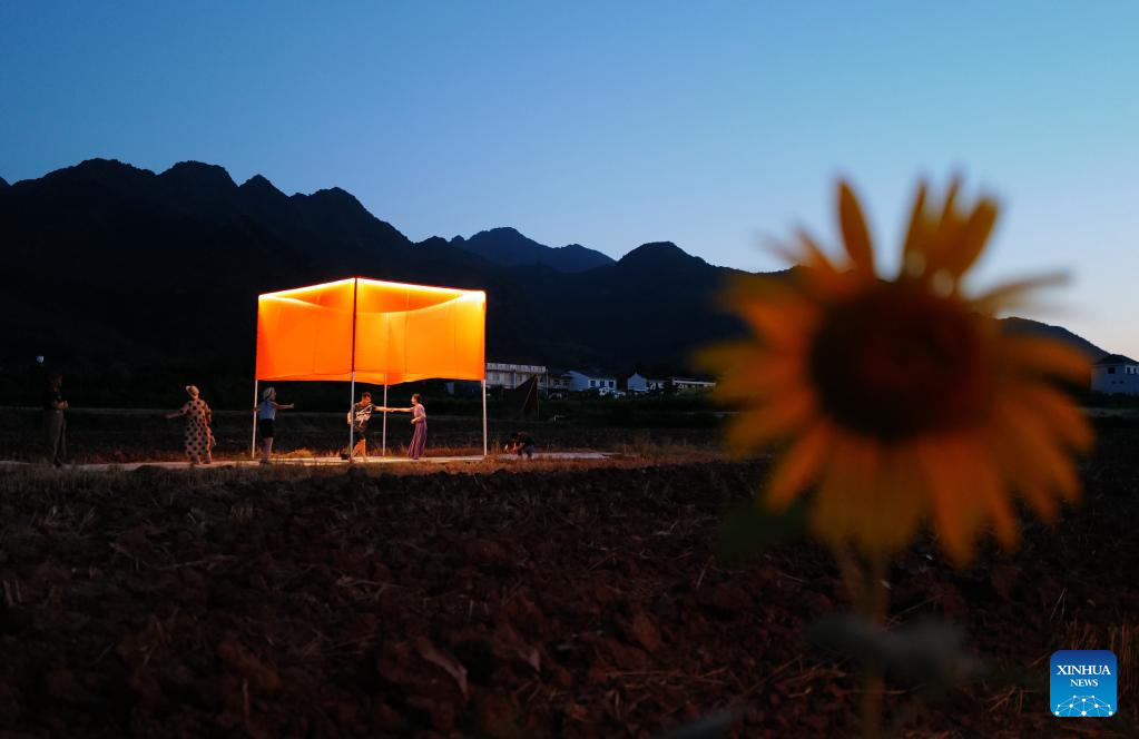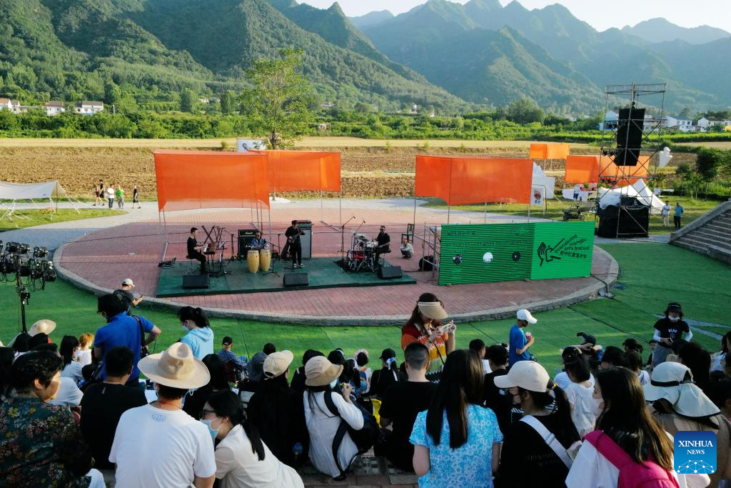 Tourists listen to an concert at an open air theater in Caijiapo Village, Huyi District of Xi'an, northwest China's Shaanxi Province, on June 12, 2022. Faculty and students of the Xi'an Academy of Fine Arts have been working with artists to transform villages by practicing their profession. Such transformation, combining rural tradition with modern lifestyles, turns plain grain fields and farmhouses into places of interest that promote rural culture and rural tourism. (Xinhua)