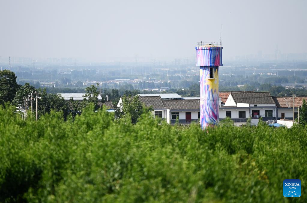 Photo taken on July 5, 2022 shows a manually decorated water tower in Caijiapo Village, Huyi District of Xi'an, northwest China's Shaanxi Province. Faculty and students of the Xi'an Academy of Fine Arts have been working with artists to transform villages by practicing their profession. Such transformation, combining rural tradition with modern lifestyles, turns plain grain fields and farmhouses into places of interest that promote rural culture and rural tourism. (Xinhua/Li Yibo)