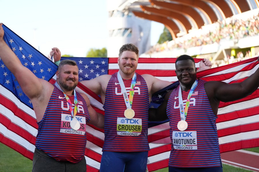 On the field, two-time Olympic champion Ryan Crouser reinforced his dominance in the men's shot put by winning his first senior world title in a championship record of 22.94 meters. Two-time world champion Joe Kovacs and Josh Awotunde finished the American podium sweep in 22.89 and 22.29 respectively.