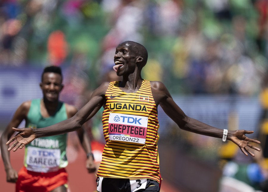 Uganda's Joshua Cheptegei celebrates after the men's 10000m final. (Xinhua/Wang Ying)