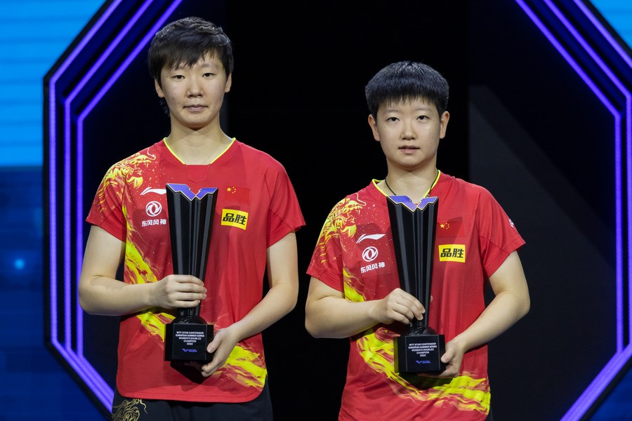 Gold medalists Sun Yingsha (R)/Wang Manyu of China pose for photos during the awarding ceremony after the women's doubles final. (Photo by Attila Volgyi/Xinhua)