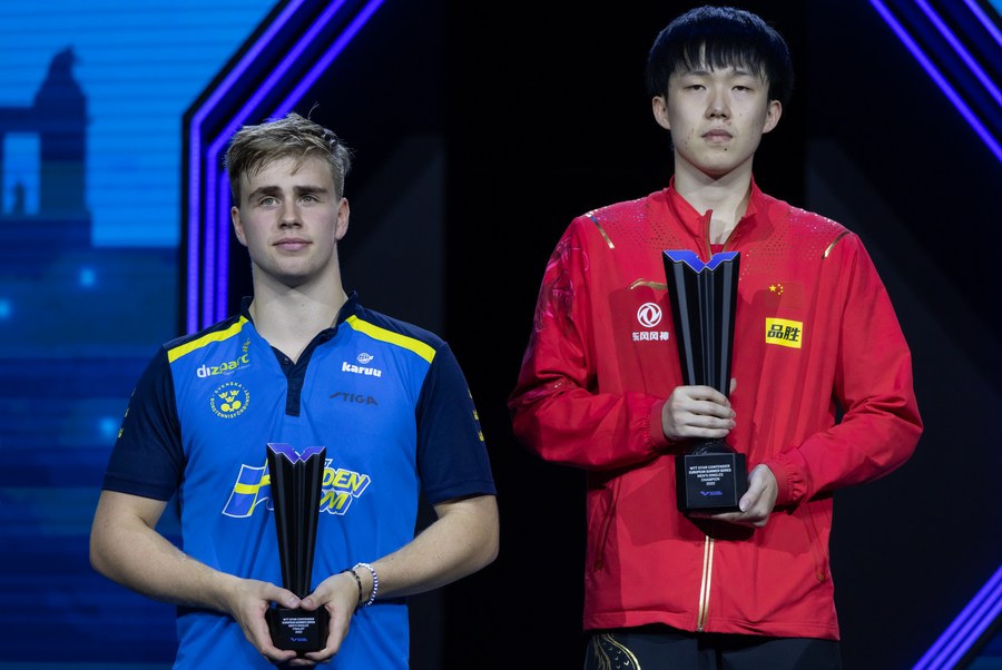Gold medalist Wang Chuqin (R) of China and silver medalist Truls Moregard of Sweden pose for photos during the awarding ceremony after the men's singles final at the World Table Tennis Star Contender European Summer Series 2022 in Budapest, Hungary on July 17, 2022. (Photo by Attila Volgyi/Xinhua)