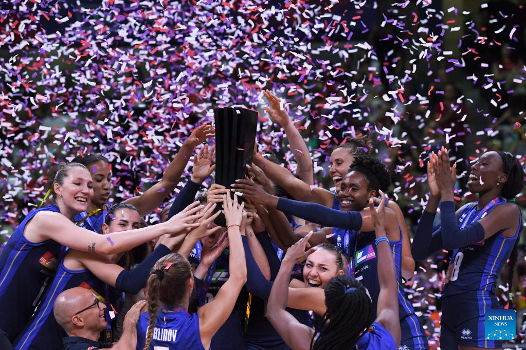 Players of Italy celebrate winning the 2022 FIVB Volleyball Women's Nations League gold medal match between Italy and Brazil in Ankara, Türkiye, July 17, 2022. (Xinhua/Shadati)