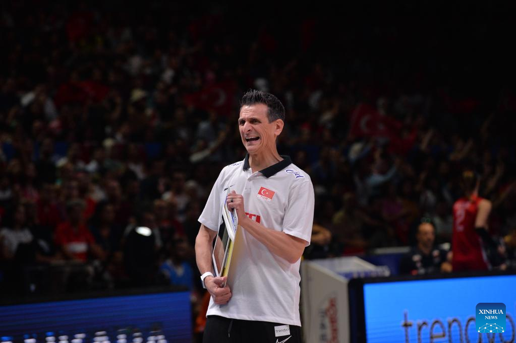 Giovanni Guidetti, coach of Türkiye, reacts during the 2022 FIVB Volleyball Women's Nations League bronze medal match between Serbia and Türkiye in Ankara, Türkiye, July 17, 2022. (Photo by Mustafa Kaya/Xinhua)