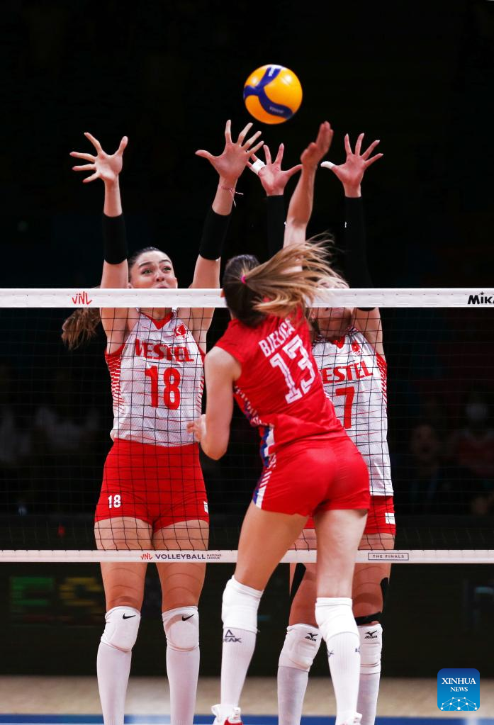 Gunes Zehra (R) of Türkiye spikes the ball during the 2022 FIVB Volleyball Women's Nations League bronze medal match between Serbia and Türkiye in Ankara, Türkiye, July 17, 2022. (Xinhua/Shadati)