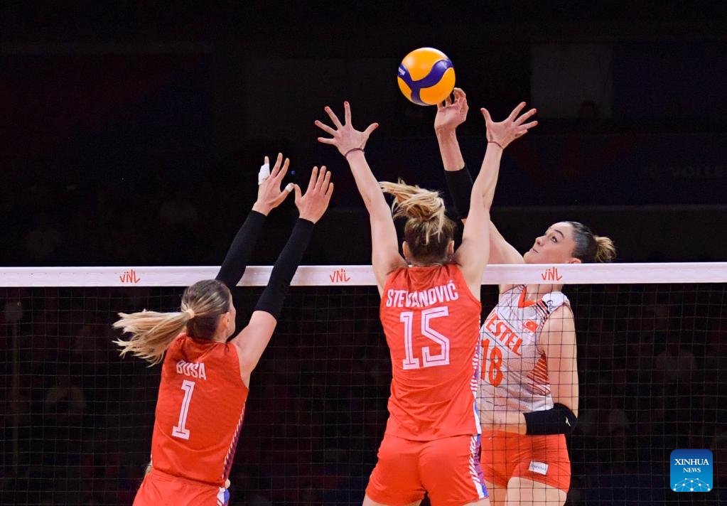 Bjelica Ana (C) of Serbia spikes the ball during the 2022 FIVB Volleyball Women's Nations League bronze medal match between Serbia and Türkiye in Ankara, Türkiye, July 17, 2022. (Photo by Mustafa Kaya/Xinhua)