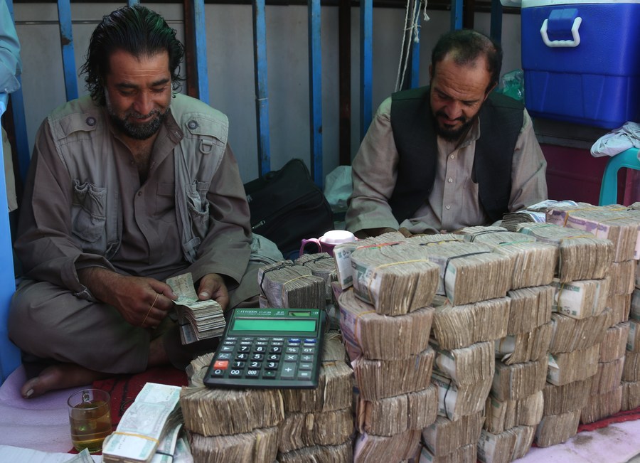 Dealers count cash at a money exchange market in Kabul, Afghanistan, on July 17, 2022. (Photo by Saifurahman Safi/Xinhua)