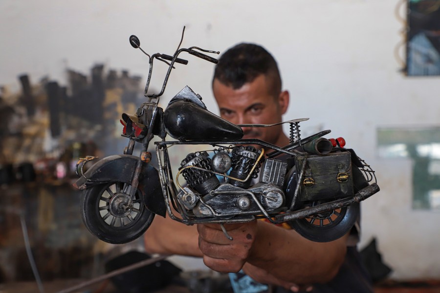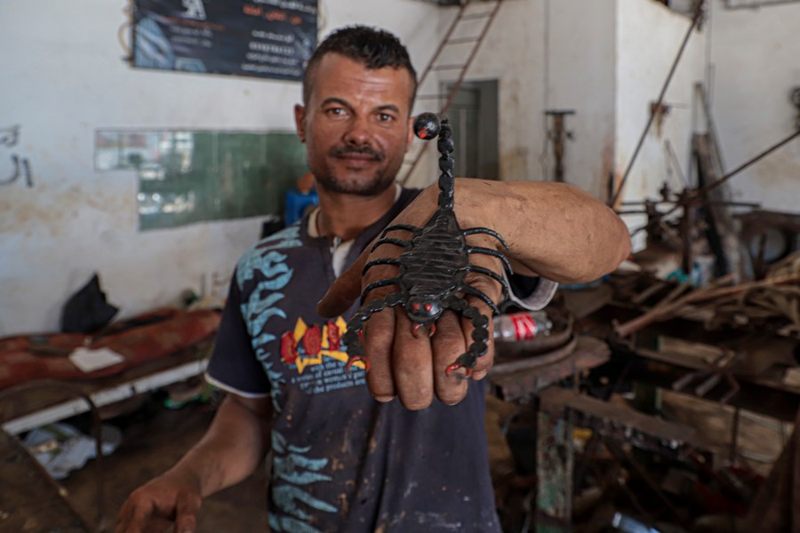 Fakher Hamad, a hearing impaired Palestinian, displays his work made of iron at his workshop in Beit Hanoun town in the northern Gaza Strip, on July 18, 2022. (Photo by Rizek Abdeljawad/Xinhua)