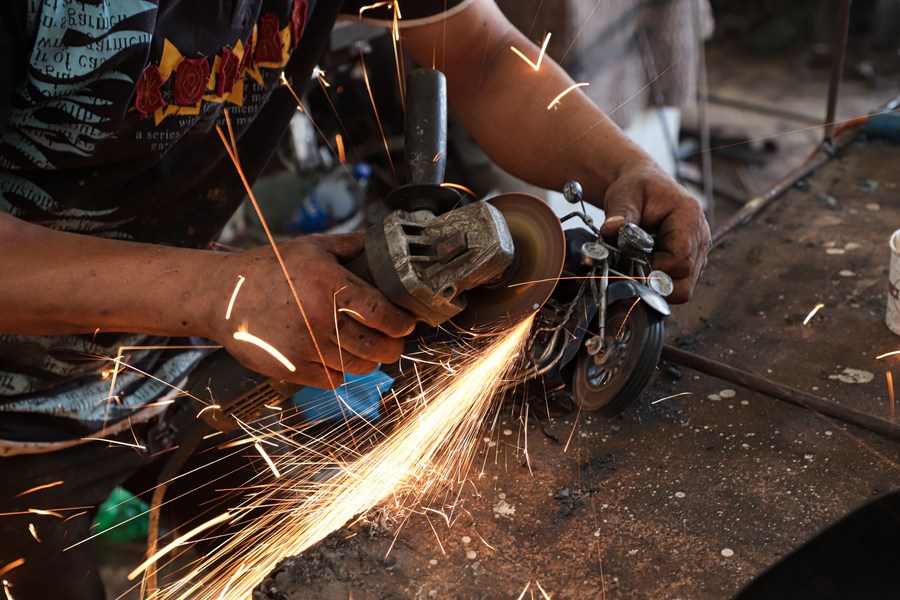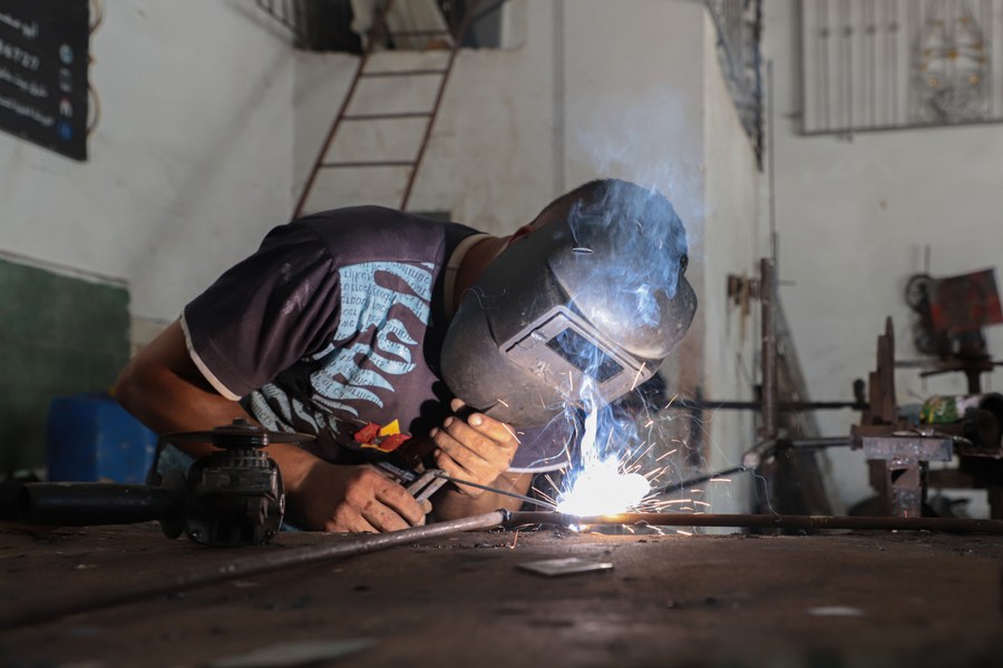 Fakher Hamad, a hearing impaired Palestinian, works on making art from iron at his workshop in Beit Hanoun town in the northern Gaza Strip, on July 18, 2022. (Photo by Rizek Abdeljawad/Xinhua)