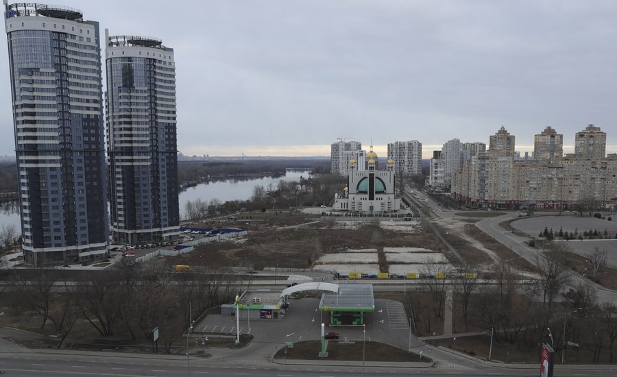Photo taken on Feb. 27, 2022 shows the empty street in the early morning in Kiev, capital of Ukraine. (Xinhua/Li Dongxu)