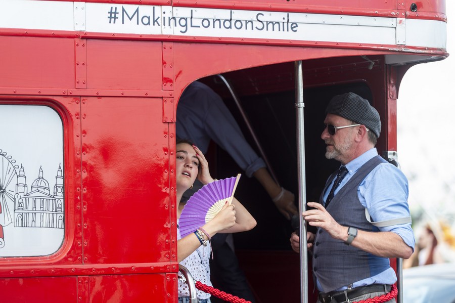 A woman uses a fan to keep cool on a bus on Westminster Bridge in London, Britain, July 11, 2022. (Photo by Stephen Chung/Xinhua)